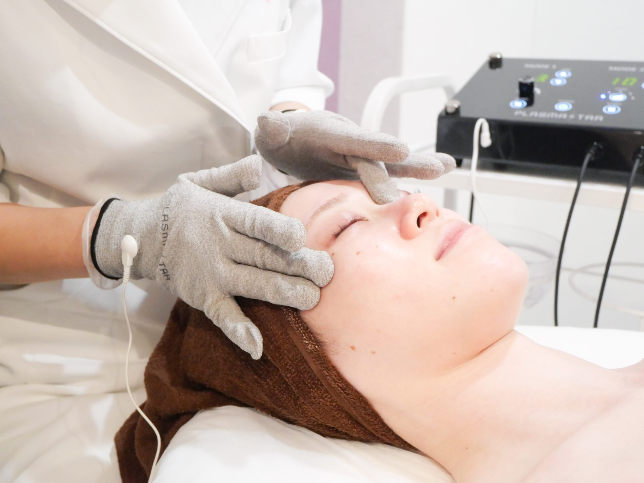 【施術時間90分】ソフトピーリング洗顔→肩甲骨~引上げるEMS小顔矯正→プラズマ照射(首+ デコルテ)